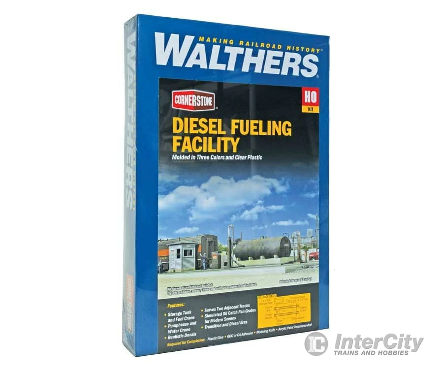 The Diesel Fueling Facility is an authentic addition to any scene and includes everything to complete a two-track fueling facility; storage tank, fuel crane, water crane, pump house and top unloading rack (for unloading diesel fuel from tank cars). For modern era modelers, environmental track “pans” to catch fuel and oil spills are also included. This model kit features plastic parts molded in appropriate colors so there’s no painting necessary. Easy-to-follow illustrated instructions make assembly fast and fun for first-time kit builders or seasoned modelers. Use the Diesel Fueling Facility on your railroad among other Cornerstone HO Scale railroad buildings.