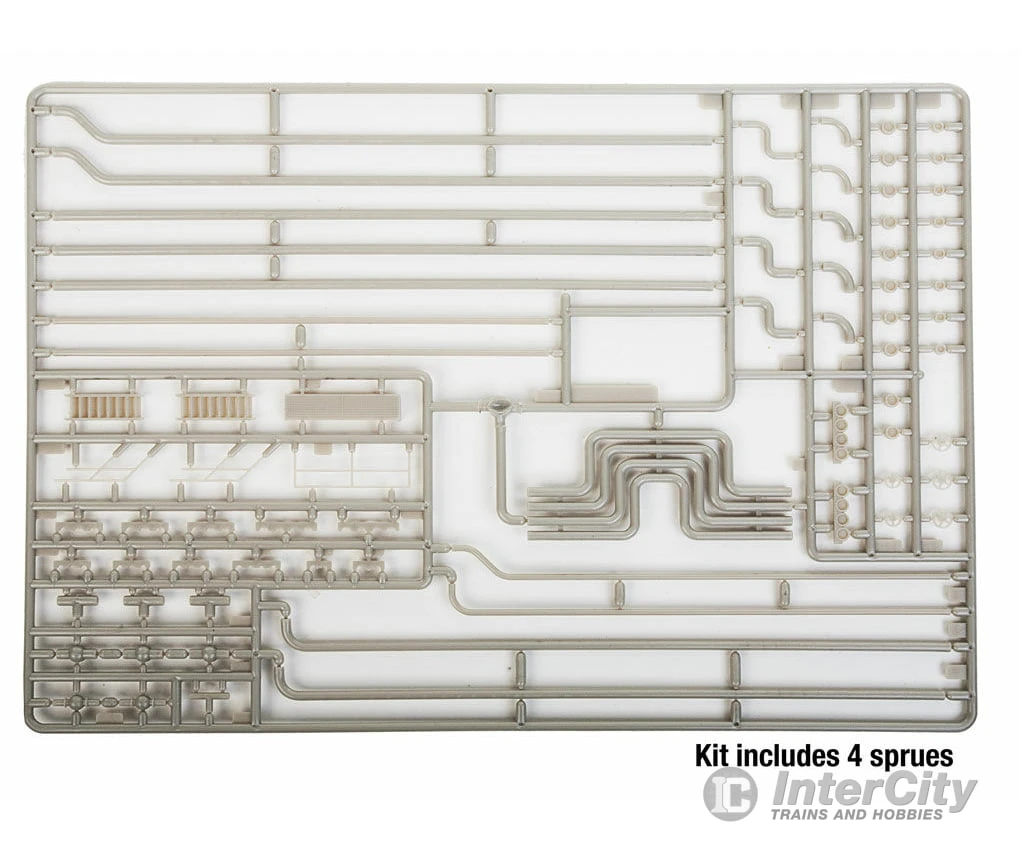 The Walthers Cornerstone HO Scale Piping Kit makes it easy to model supply lines used to bring oil and other materials to and from the loading platforms or tanks at oil dealers and other locations that use bulk liquids. The piping kit includes a variety of angles, elbows, tees, straight pipes, valves and more. Use the Piping Kit wherever your Cornerstone HO Scale industrial buildings or scenes need piping detail.