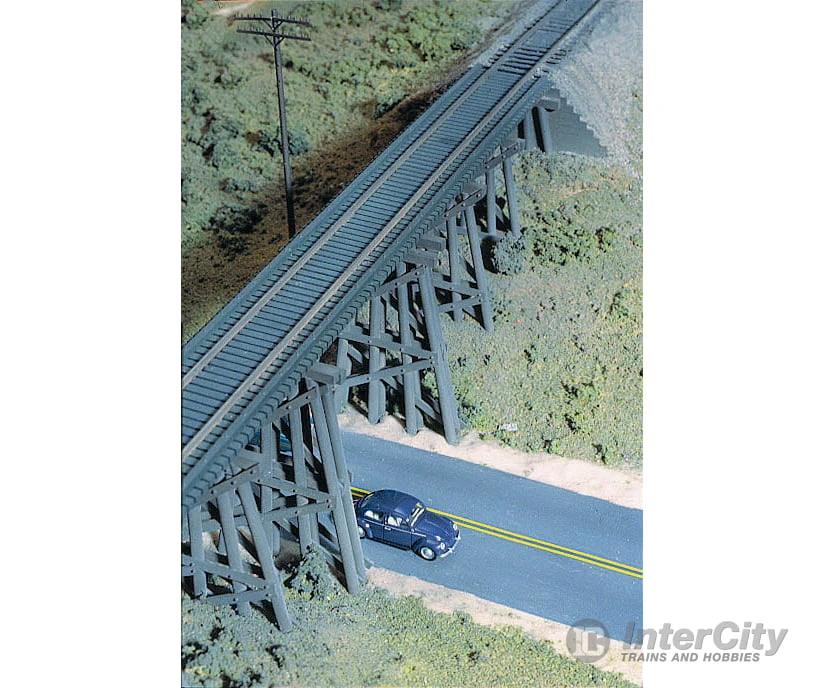 From the earliest days of railroading bridges like the Walthers Cornerstone Trestle with Deck Girder Bridge have been used to cross low spots, streams and other obstacles. In many cases a trestle was a cheaper, faster option for keeping construction moving. Trestles consist of a series of piers, called bents, which support the track. Wood was the favored building material until the 1940s, and many survive on branches and less busy lines to this day. Where piers could not be erected, such as in a flowing stream, a highway, or across another railroad, a deck girder bridge would be installed as part of the structure. This versatile kit opens lots of detailing options along your right-of-way. Perfect for use in virtually any era, the detailed plastic parts simulate the all-wood construction of the prototypes. The optional deck girder bridge gives you added flexibility, whether installed with existing scenery, or in planning new construction. Complete instructions make construction quick and easy. As shown the Trestle with Deck Girder Bridge measures: 15-1/2 x 4 x 4″ 38.7 x 10 x 10cm