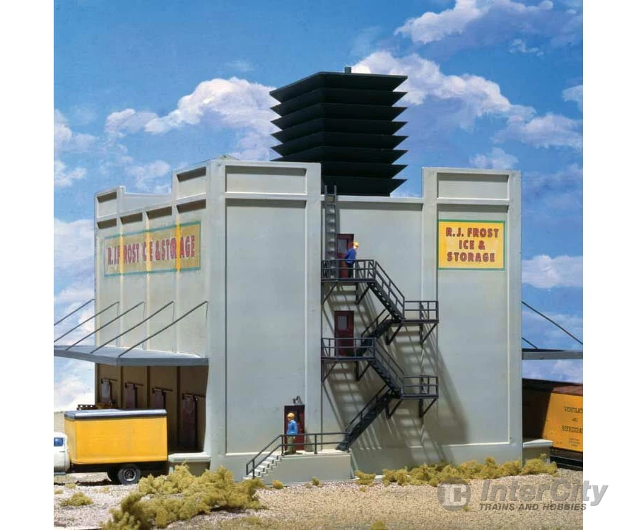 Next time you’re in the grocery store, look at the incredible variety of fresh and frozen foods available. Most of them were grown and processed in another area, then shipped to facilities like the prototypes of Walthers Cornerstone RJ Frost Ice and Storage. Along they way, they spent some of their rail and truck journey in a cold storage plant. These buildings are commonly found in agricultural areas where foods are readied for shipment, and in large cities where the food is stored for pickup by local customers. This kit captures the look and feel of a large cold storage warehouse in a size that fits most layouts. The kit includes concrete walls, truck and railcar docks with canopies and a large rooftop cooling tower. It’ll look great along your railroad’s industrial trackage or in small towns where multiple packing houses process perishables for shipment. As shown RJ Frost Ice and Storage measures: 7-1/4 x 7-1/4 x 5″ 18.4 x 18.4 x 12.7cm.