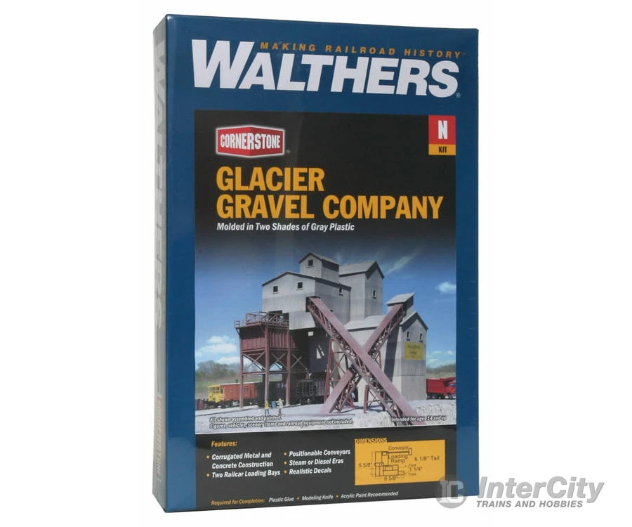 Add aggregate traffic to your layout with this rugged trackside structure. The Walthers Cornerstone Glacier Gravel Co. is a model of a stone crusher-washer with equipment for loading rail cars or trucks. Railroads have an enormous appetite for crushed rock. A mile of mainline can gobble up thousands of tons. Glacier Gravel Co. will help satisfy your railroads appetite for rock. This easy-to-build kit looks great as part of a stone quarry operation, alongside mines like the New River Mining Co. 933-3221 and Coal Flood Loader 933-3247, in a mine, or as part of a slag recovery operation down the track from the steel mill buildings. Detailed parts capture the look of concrete and steel construction. The kit features corrugated construction on a heavy poured concrete foundation/loading tunnel. Conveyors to a truck dump and feeder from the quarry complete the facility. Rock crushers similar to this have been in use since the 1940s, so Glacier Gravel Co. will fit perfectly into transition and modern era layouts. The main building can accommodate two tracks inside and includes a detailed loading bin. Glacier Gravel Co. also includes decal signs and complete instructions. Glacier Gravel Co. is just one of a wide variety of Cornerstone N Scale industrial buildings.The finished model measures: 5-5/8 x 6-5/8 x 6-1/8″ 14.3 x 16.8 x 15.6cm