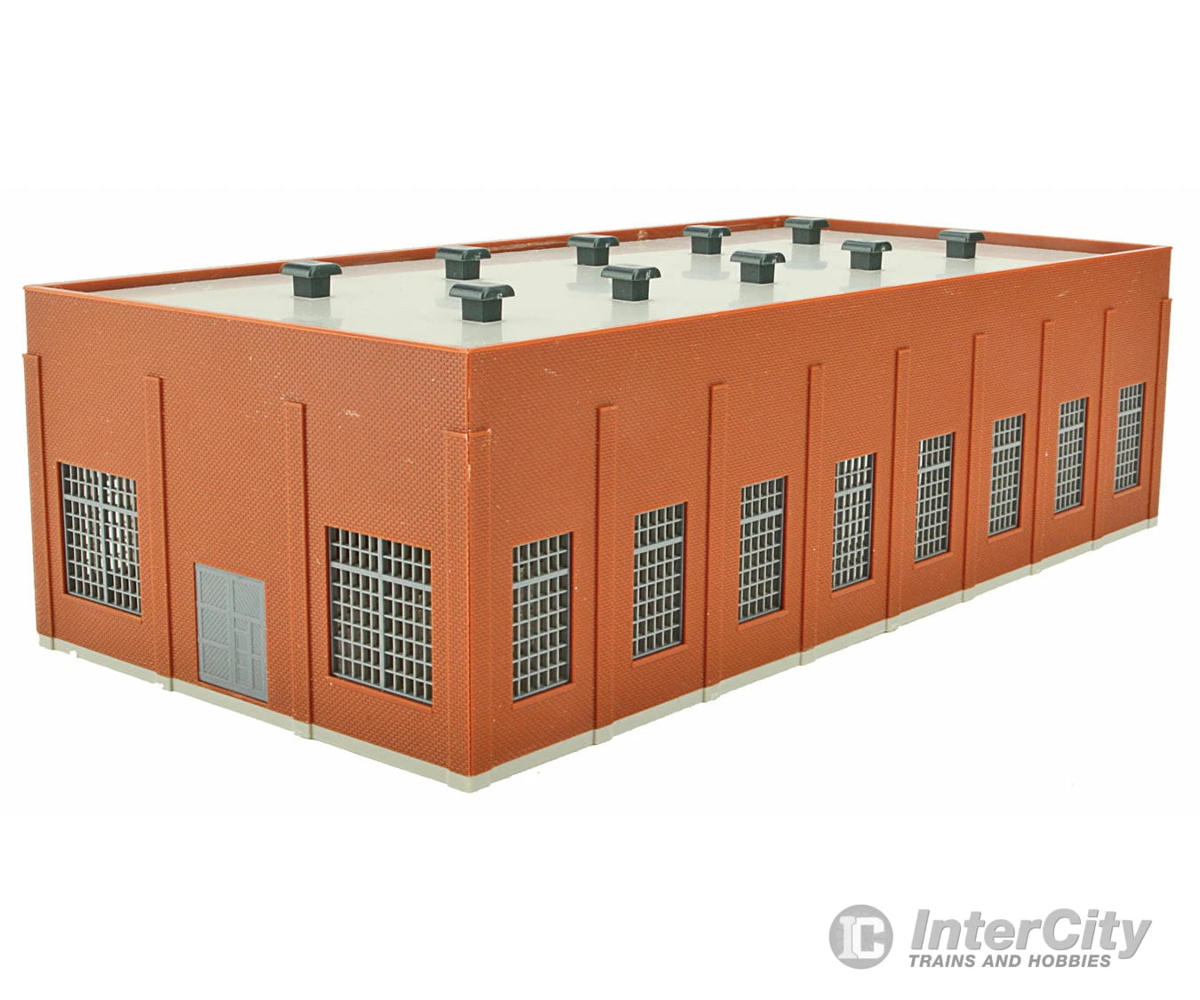 Bring your engine terminal to life with this Cornerstone Two-Stall 130′ Brick Diesel House. Typical of shop buildings constructed from the 1930s on especially to repair and maintain diesels, structures like this can still be found at many terminals. Based on Milwaukee Road prototype, this engine house looks great in any diesel-era servicing scene and is adaptable to other industrial scenes. The Two-Stall 130′ Brick Diesel House is one of many Cornerstone N Scale railroad buildings.