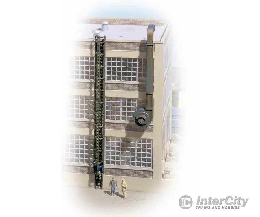 Add detail to your factory buildings with Walthers Cornerstone HO Scale Caged Ladders and Vents. On real structures, caged safety ladders are required for any ladder access over 10′ 3m tall and can be found on virtually any American industrial building. A great way to modernize older buildings or detail contemporary structures, the set includes five complete ladder and cage assemblies. Plus, you get five wall-mounted vents that can also be fitted on the outside of almost any building.