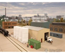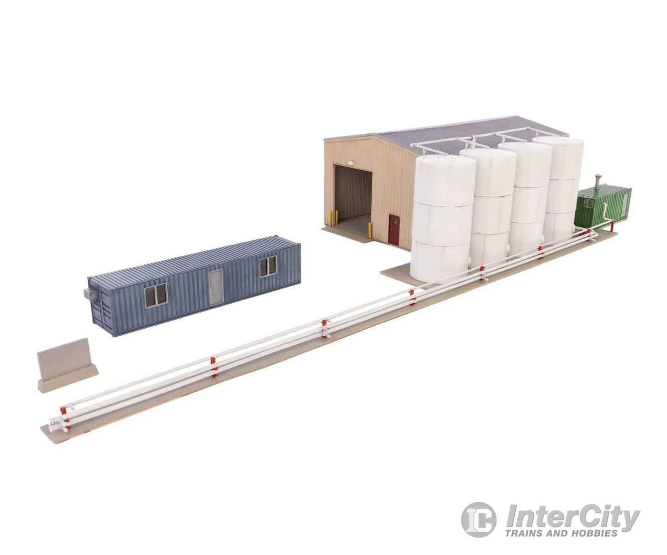 Model the vital transition of cargo between railcars and trucks with incredible detail with this Corn Syrup Transfer Facility. Corn syrup is used in baked goods, candies, beverages, canned fruits and vegetables and pharmaceuticals. The liquid is transloaded from tank cars to storage tanks, then into tanker trucks for delivery to industries. Corn syrup benefits from steam heat to help it flow so small boilers are a common feature of sites like this. Trucks pull into the transfer garage to make the transload under cover from the weather. Of course the site manager needs a place to do paperwork and a converted shipping container makes a great office. This kit includes: