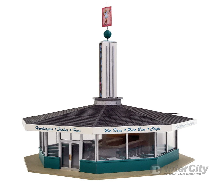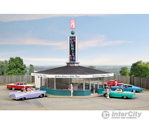 We couldn’t bring back 25-cent a gallon gas, so we’re serving up a big slice of fresh-baked nostalgia with the Walthers Cornerstone Donnie’s Drive-In! This classic model is typical of the roadside restaurants that flourished along state and federal highways in American cities during the 1950s and 60s, some of which are still THE place for family fun and great food today. Easy-to-build plastic kit includes plastic parts molded in colors, along with interior furnishings. The removable roof makes adding figures (sold separately) or other superdetails a snap. As shown Donnie’s Drive-In measures: 5-13/16 x 6-11/16 x 5-1/8″ 14.5 x 16.7 x 12.8cm