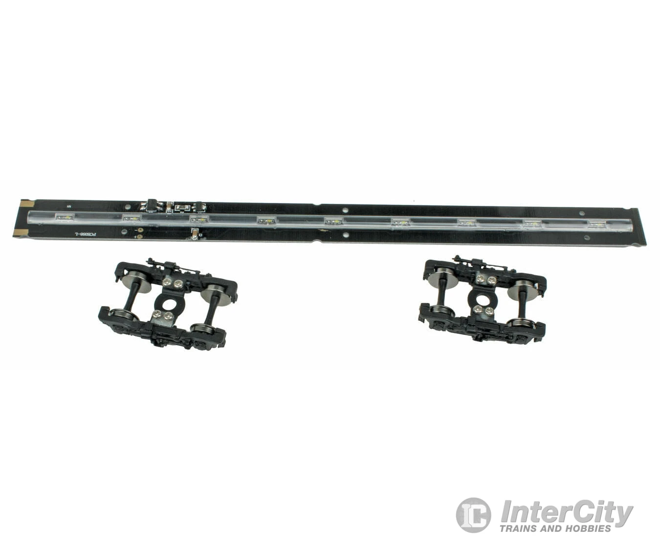 Make your Walthers Mainline Budd streamline car shine with this easy to install lighting kit that fits most Mainline models (unless noted – see below). It includes an assembled LED light bar, die cast 41-N-11 trucks with turned metal 36″ wheels, body-mounted coupler boxes with extended swinging drawbar, bushing and cover for operation on 18″ and larger radius curves, four wipers, left and right interior electrical contacts, a mounting block and complete, illustrated instructions.