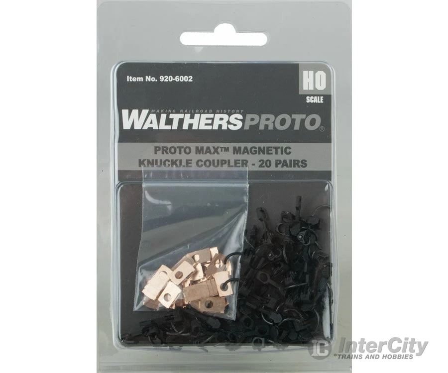 Walthers Proto MAX(TM) couplers are an easy upgrade for old or new equipment and provide magnetic uncoupling action. Fully assembled, they fit most HO equipment, and each realistic coupler features a tough die cast metal head and shank, factory-installed metal knuckle spring, and a separate metal centering spring. This bulk pack is perfect for upgrading your entire fleet! Includes couplers and centering springs only.