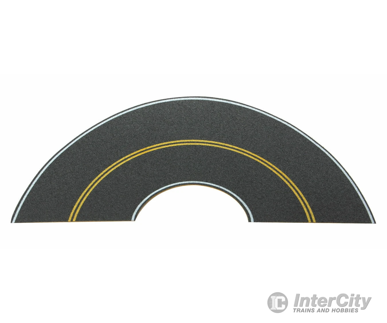 Combine this set of SceneMaster curves with straight sections (each sold separately) to simplify roadway installations in new or vintage scenes. Features solid double yellow centerlines to indicate no passing zone, and solid white edge markings. Easily cut to various sizes. Measures 3-1/8 wide with 9″ outside diameter, 80 x 230mm.