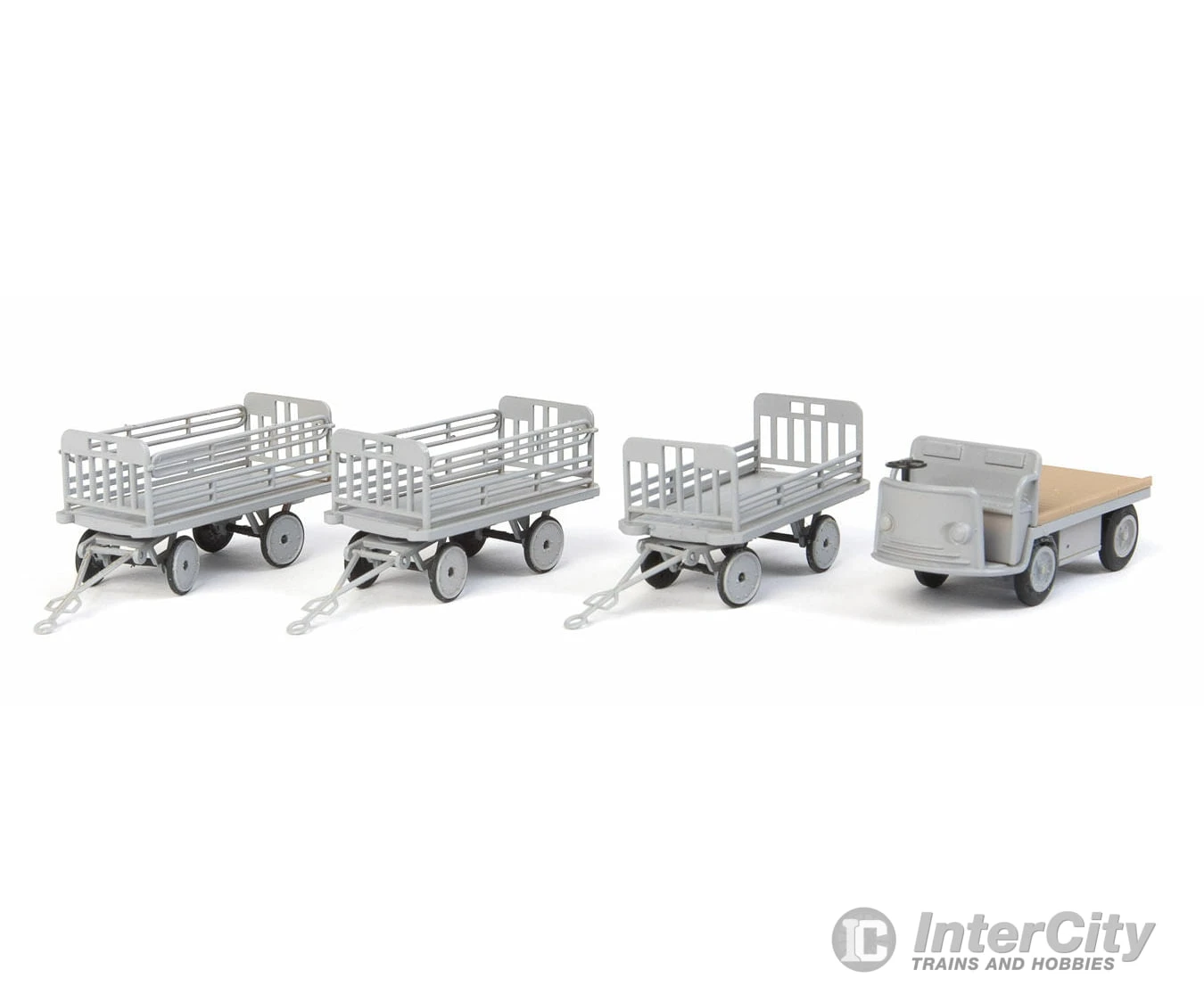- Parts for detailed electric tractor (non-operating) and three baggage trailers molded in gray plastic