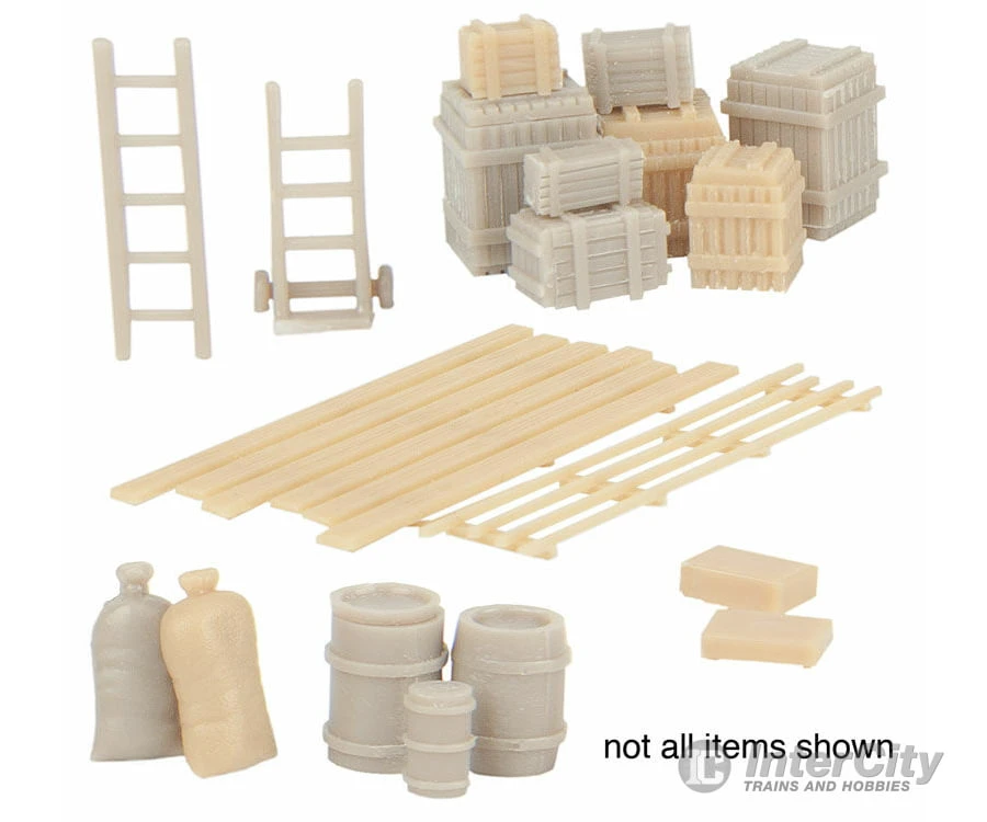 Turn empty loading docks into detailed scenes in minutes with the Walthers Scene Master Freight Loads. Perfect as loads for road or rail equipment, you can use these parts to detail stations, freight houses, many businesses and all types of industries. A great value with 146 parts molded in two colors, the set comes with large and small wooden crates, hand truck, sacks, machinery and barrels.