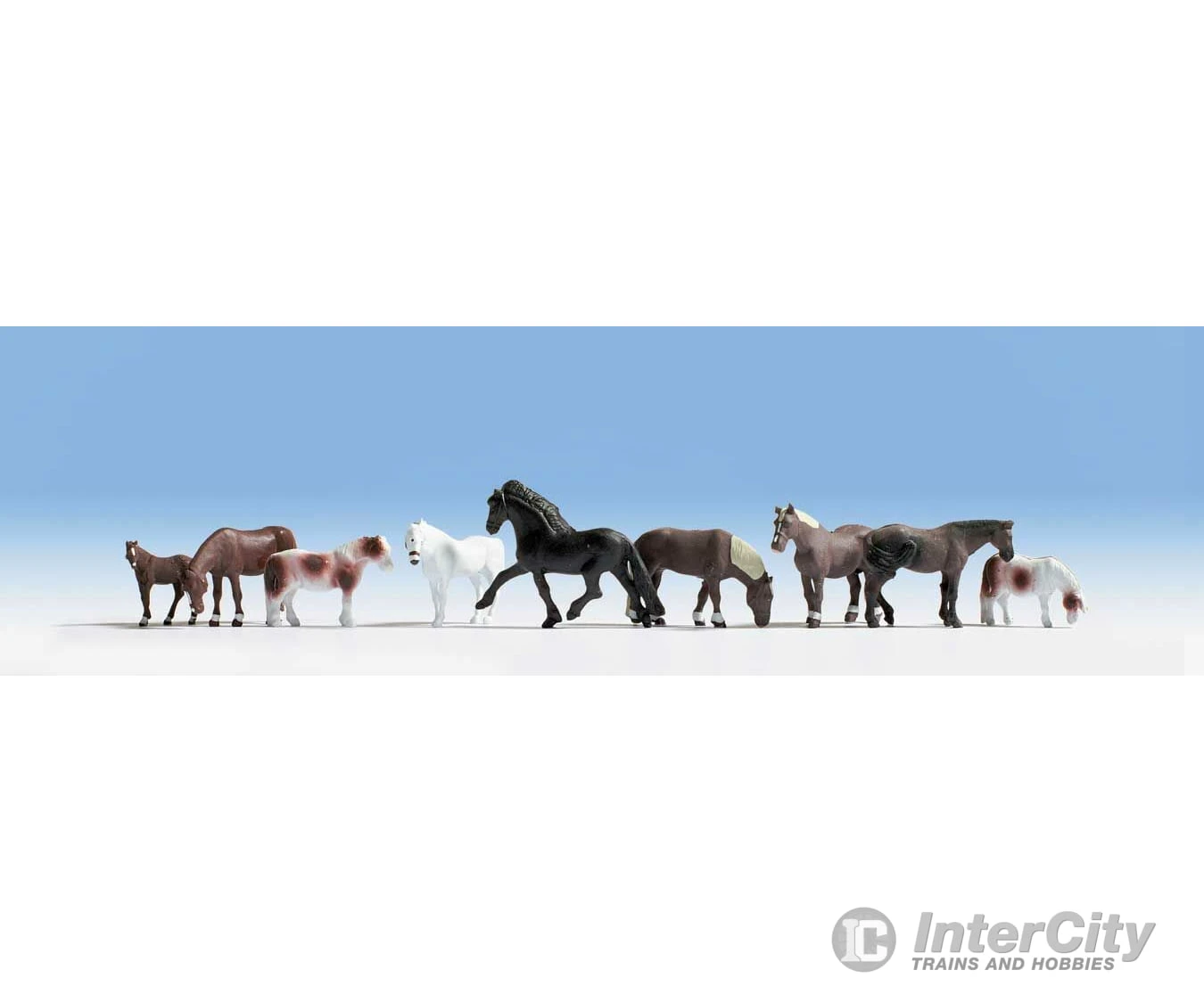 Bring your HO farm scenes to life in minutes with this ready-to-use figure set! Molded in realistic poses and hand-painted, this set includes nine assorted horses.