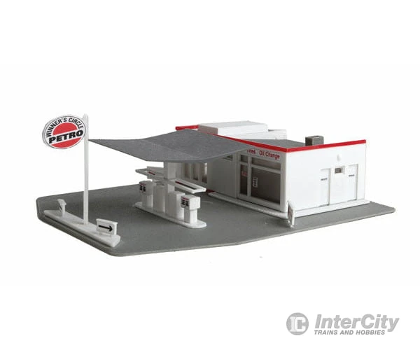 The Gas Station is an easy-to-build WalthersTrainline kit that’s perfect for cities and towns on streets along your railroad. Featuring North American styling, this building has a canopied pump island, garage bay, office and streetside signs. This model kit features plastic parts molded in appropriate colors so there’s no painting needed. The kit also includes colorful printed signs for easy-to-apply decoration. Easy-to-follow illustrated instructions make assembly fast and fun for first-time kit builders or seasoned modelers.